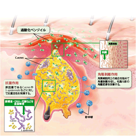 ニキビ菌への殺菌作用と、毛穴の詰まりを改善する角質剥離(ピーリング)作用の2つの働きを有します。
